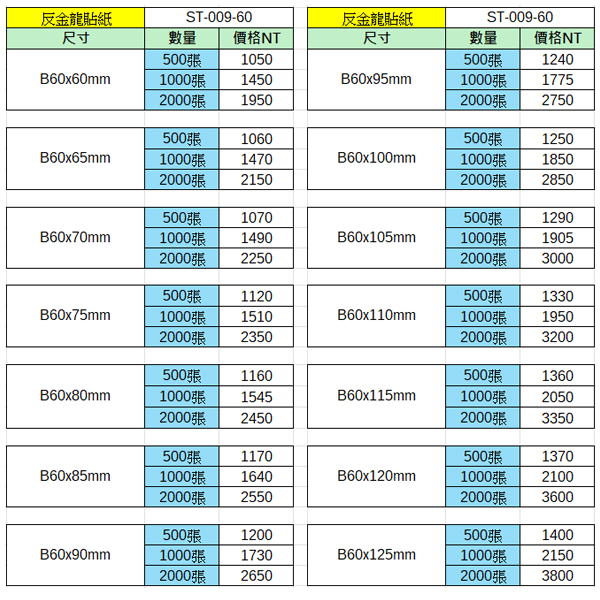 反金龍貼紙60x60~60x125mm(2000張)