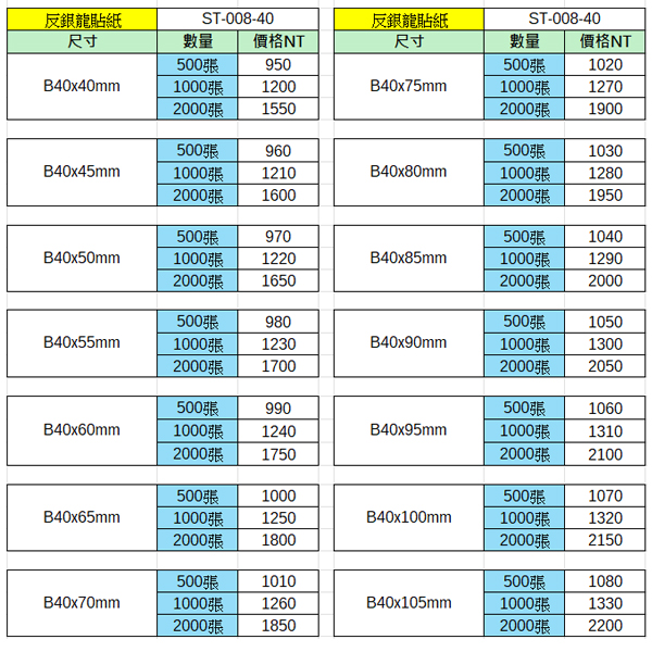 反銀龍貼紙40x40~40x105mm(2000張)