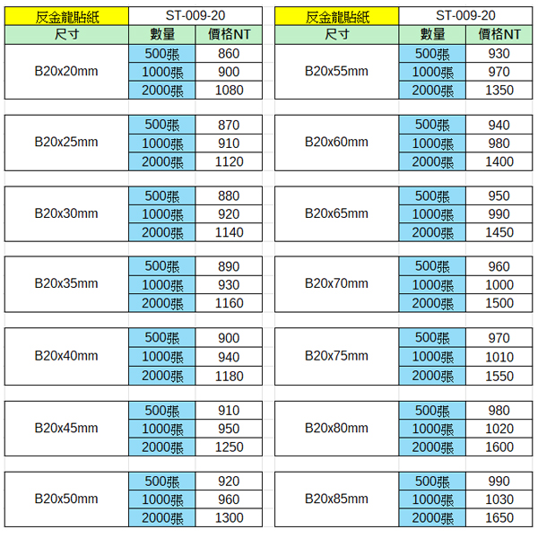 反金龍貼紙20x20~20x85mm(2000張)