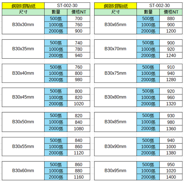 銅版R膠貼紙30x30~30x95mm(2000張)