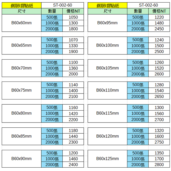 銅版R膠貼紙60x60~60x125mm(2000張)